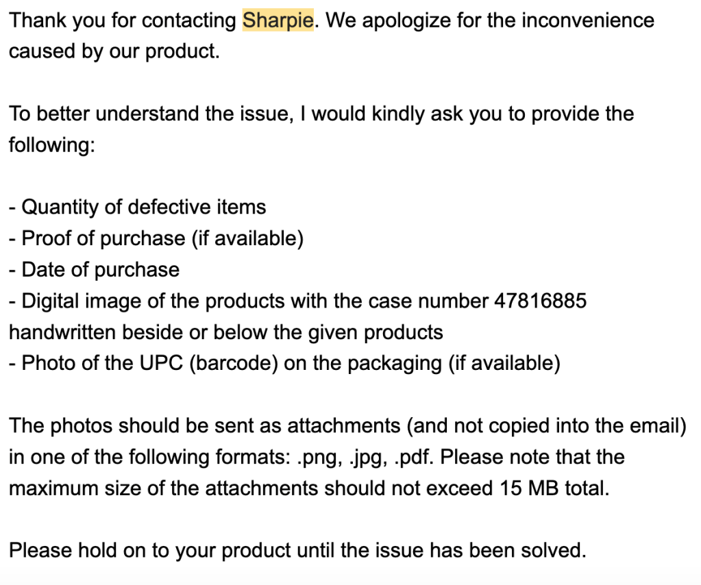 Maybe I’m treating Sharpie unfairly. I have been a little lonely lately. I can’t expect a major corporation to read every message carefully, and I’m sure the majority of those reaching out are hoping to be compensated for a faulty product. I wanted to let Sharpie know there was a problem, and that I loved the product anyway. There probably aren’t a ton of weirdos like me who assume the people who work at a company would be happy to hear someone appreciates what they do. Maybe employees there don’t even get the chance to read the fan mail. The Sharpie policy is treat every claim the same way. I get it. Only I wasn’t asking for anything. Sharpie followed up again a few days after that to ask if they had resolved my issue. Remember that Twilight Zone where the guy just wants to read in peace and everyone else disappears? That last email from Sharpie was the part where he steps on his glasses.
